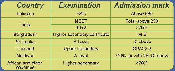 - The applicant should be between 18-25 years old, mental and physical healthy, has completed the senior high school course with good marks, satisfied with the following marks requirement, has solid financial support to afford the study and living expenses in China.